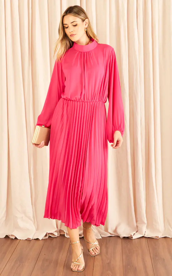 Aftershock Gold Pleated Dress in Pink features a small stand-up collar and an opening with buttons at the back of the neck. Long balloon sleeves with concealed narrow elastic band at the cuffs, elasticated waist.
