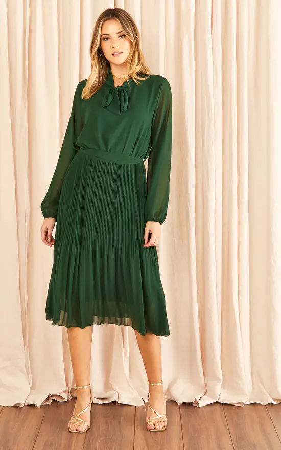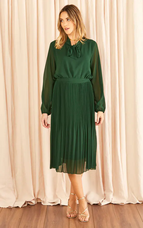 Aftershock Gold Pleated Dress with Pussybow in Green features a small stand-up collar with a bow detail, long balloon sleeves with concealed narrow elastic band at the cuffs and elasticated waist with a tie-belt.