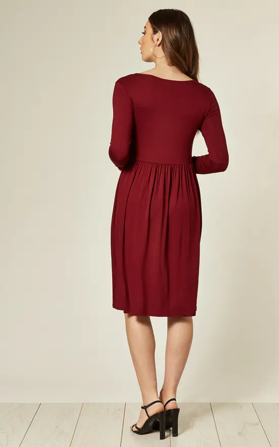 The Gathered Waist Dress In Wine is made from a soft viscose blend and features a round neckline, long sleeves and gathered waist.