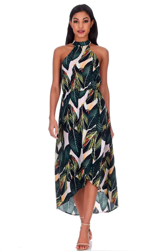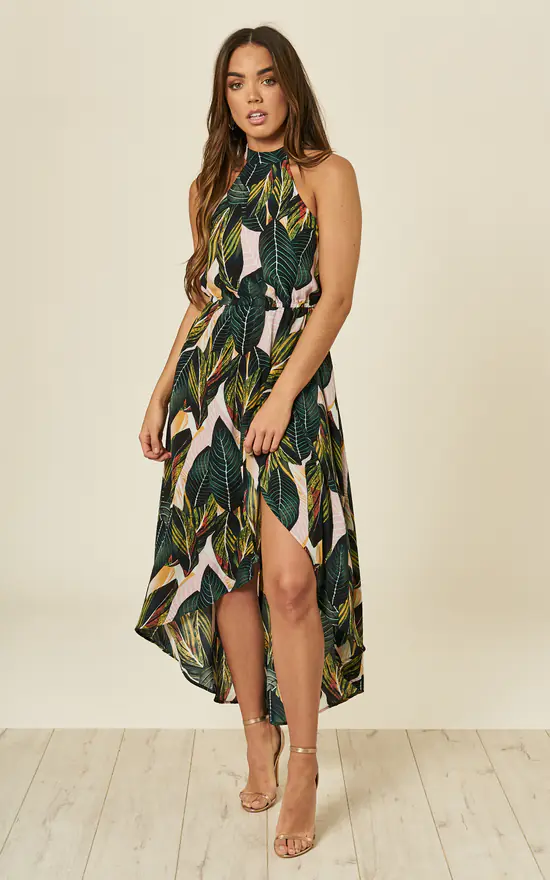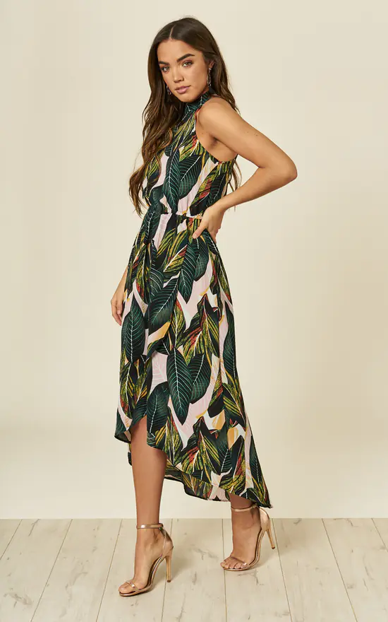 This is our leaf printed asymmetric choker neck dress. Featuring a wrap front and a elasticated waist! Style with nude heels and all the right accessories to compete the look!