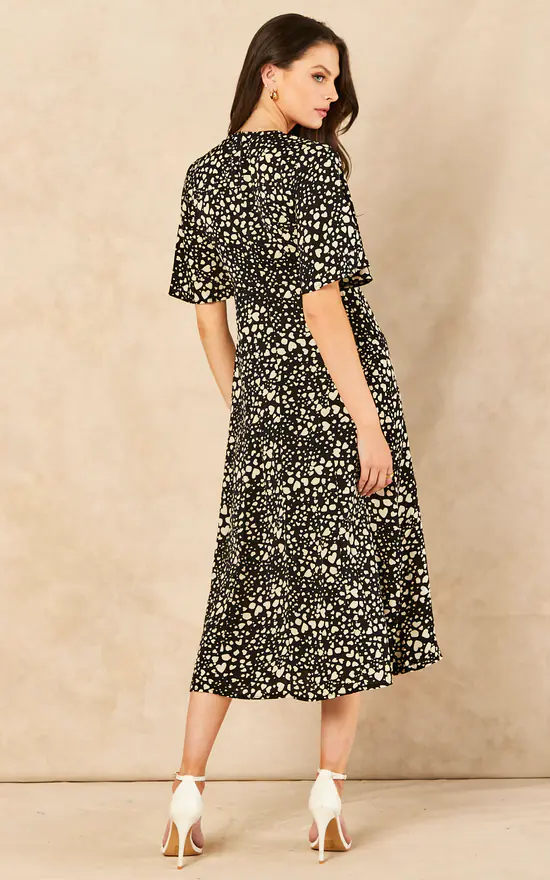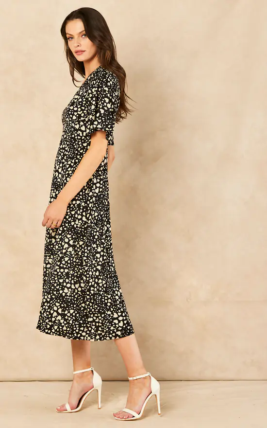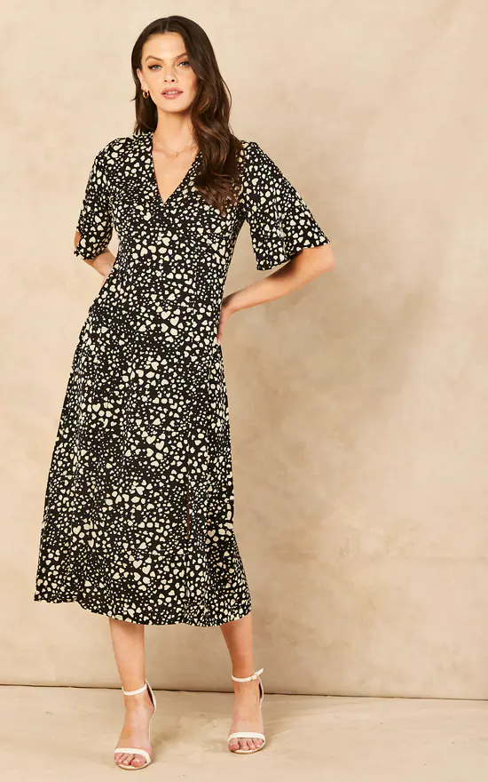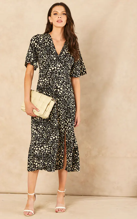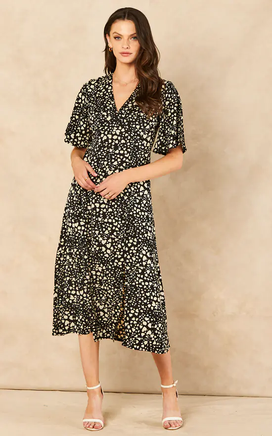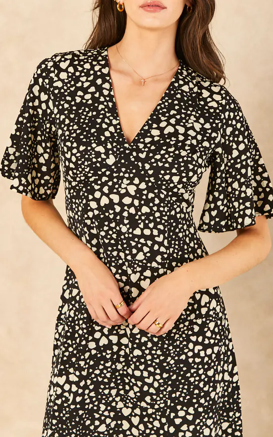 Make a statement in this heart print dress. With angel sleeves, V neck and spilt leg detail, this dress is a great addition to your wardrobe. Can be worn with flats during the day and heels for the evening. The perfect day to night dress.