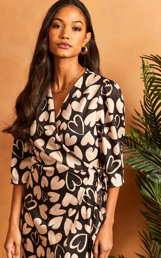 Stand out from the crowd in this beautiful bold heart print wrap dress. It is just what your Spring/Summer wardrobe needs.