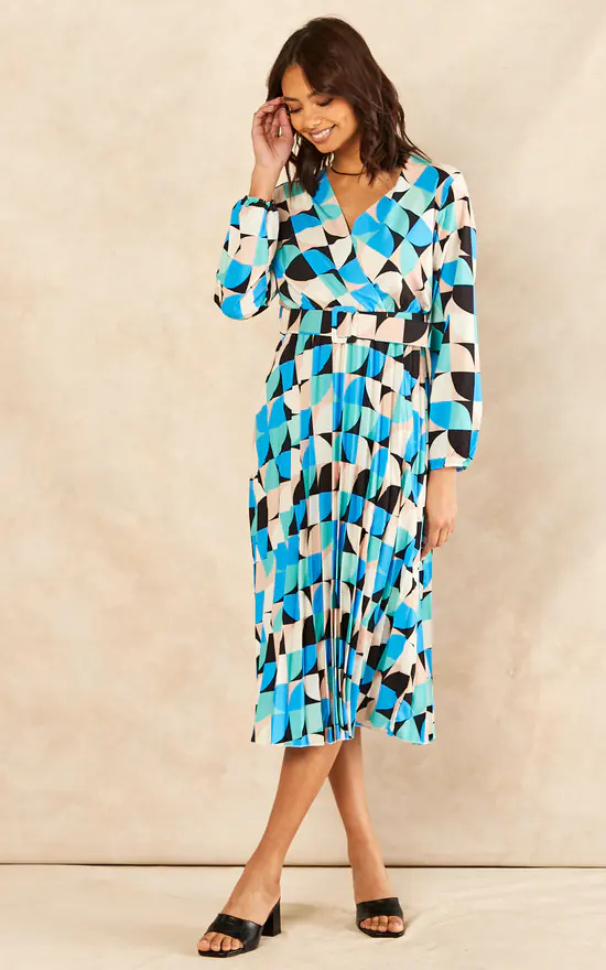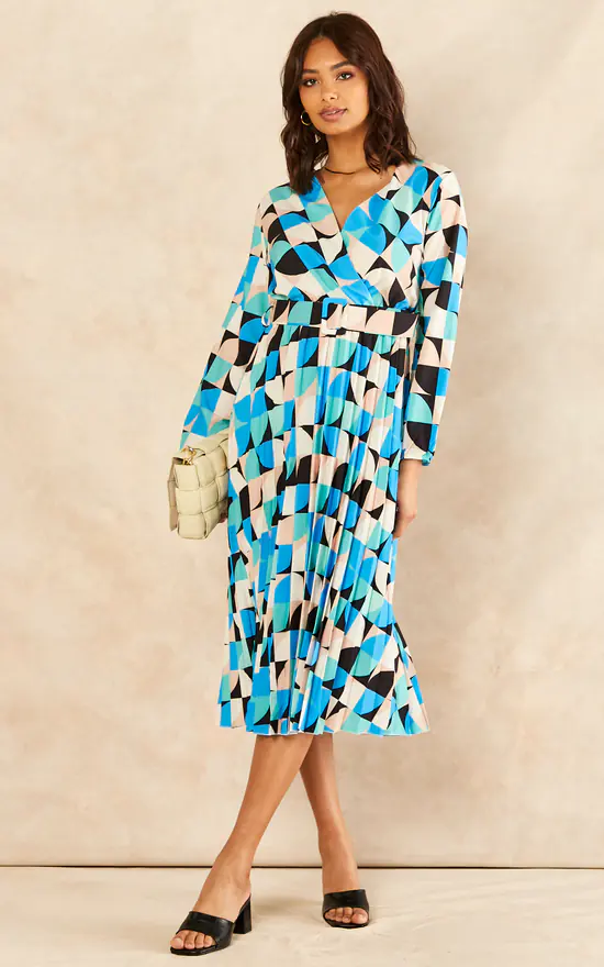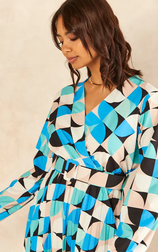 Make a statement in this geometric print dress. With long sleeves, V neck and belt detail, this flowy dress is a great addition to your wardrobe. Can be worn with trainers or heels for going out.