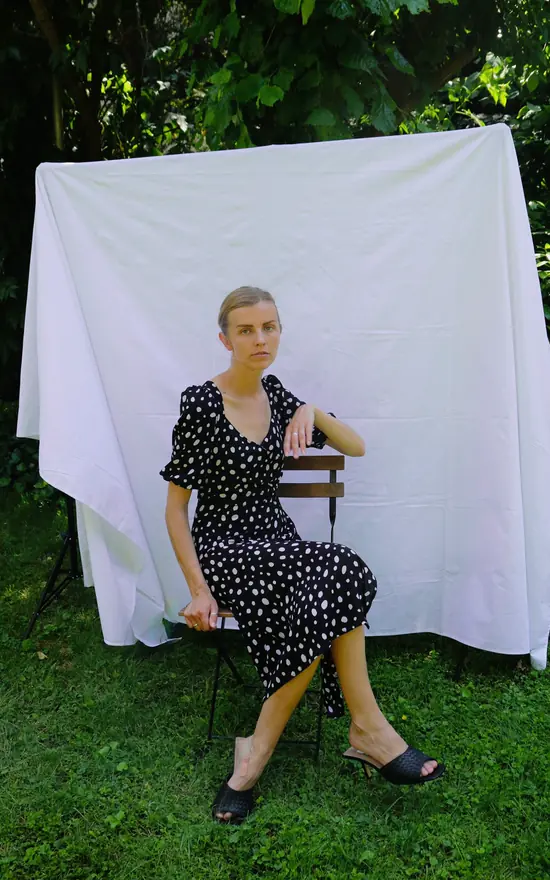 The Alexan dress is form fitted midi polka dot dress with short sleeves and one slit on the left side.