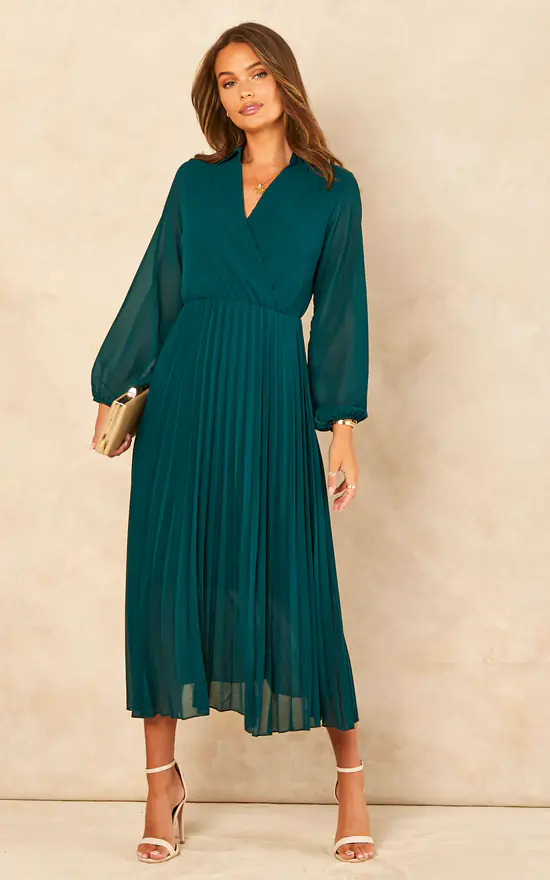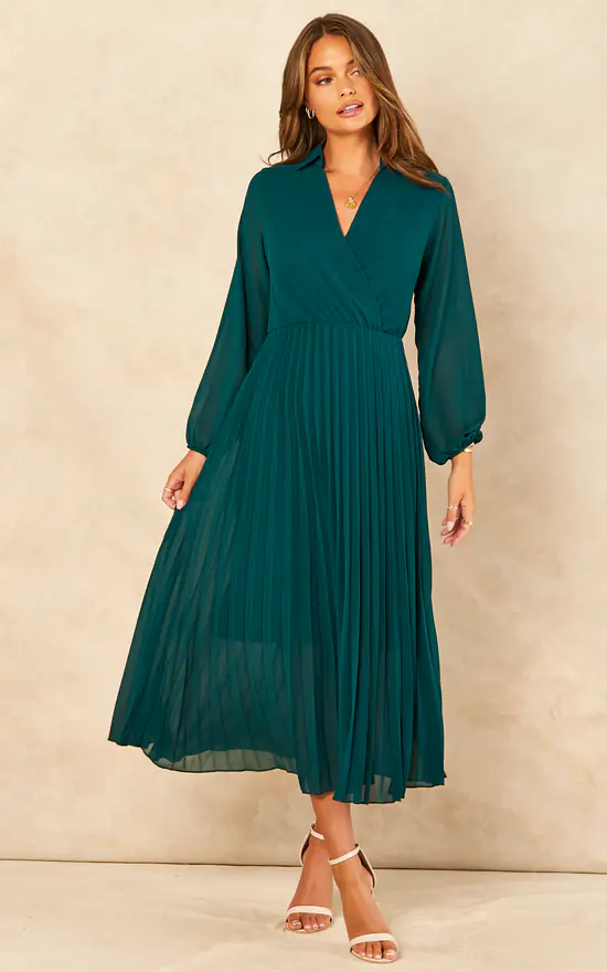 One thing that will never go out of style are pleated dresses. Our Amryn dress is no different. It features a pleated bottom, along with a mesh layer, a wrap front, and a collared neckline. Stylish but also professional, this dress can be worn when having a cocktail with friends after work.