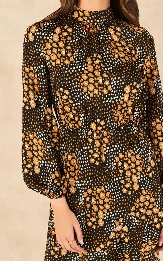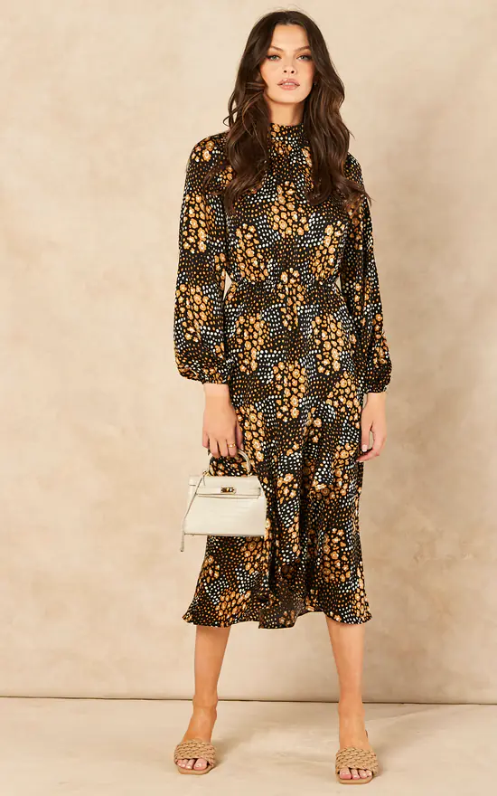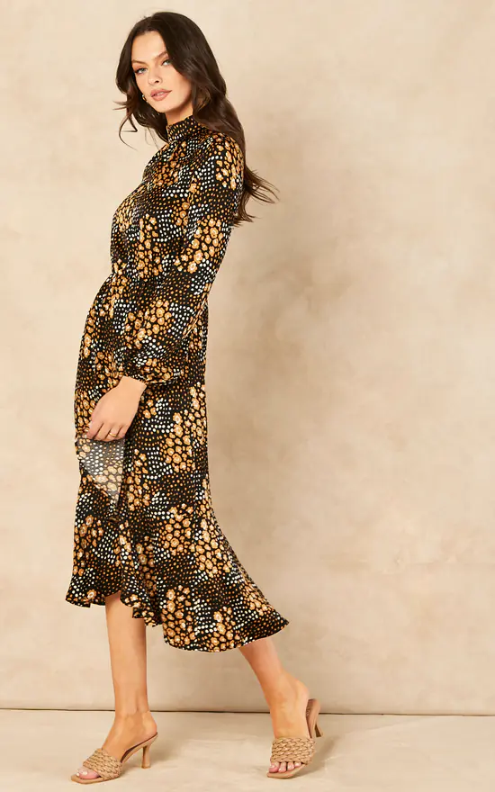 The Blouson Elasticated Wrap Midi Dress features a floral and polka dot print, a wrap bottom, and a high neck. Fancy events and date nights are right on this dress’s aisle. Simply match with ankle black boots and a mini bag.