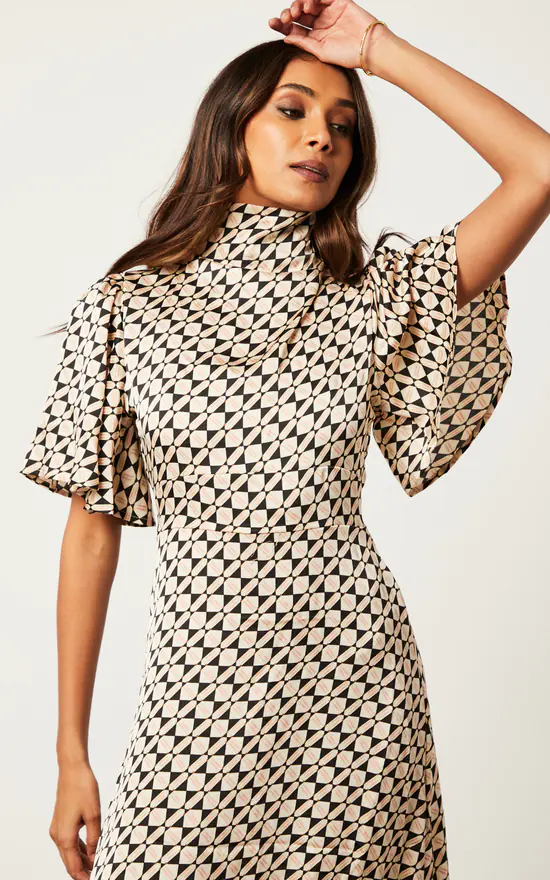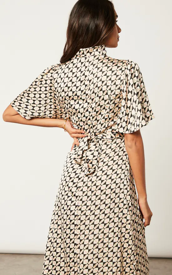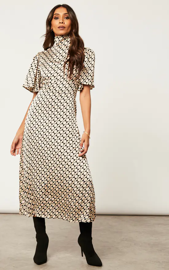 Want a dress that is suitable for the workplace and then later on when having casual drinks? Look no further than the Cowl Neck Midi Dress with Angel Sleeve. With a waist belt, back zip, a geo print and and a playful cowl neck, this dress has all the elements you need! Match with heeled shoes.