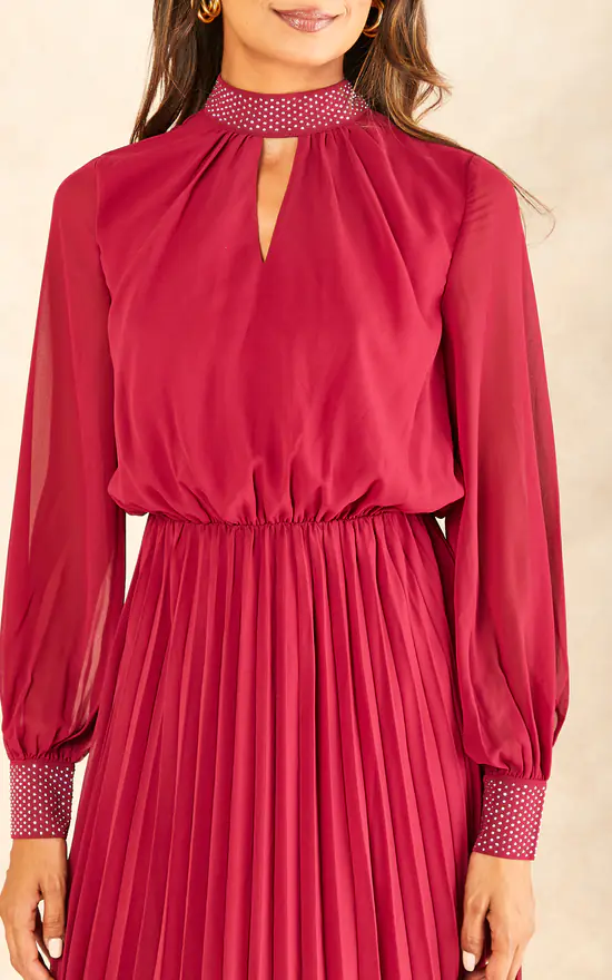 Go to a fancy dinner party with this midi dress in wine. Featuring a collar and wrist diamond detail, a front keyhole and pleated design for that final elegant touch, this wine colour dress with a mesh top layer will look wonderful when matched with black stilettos.