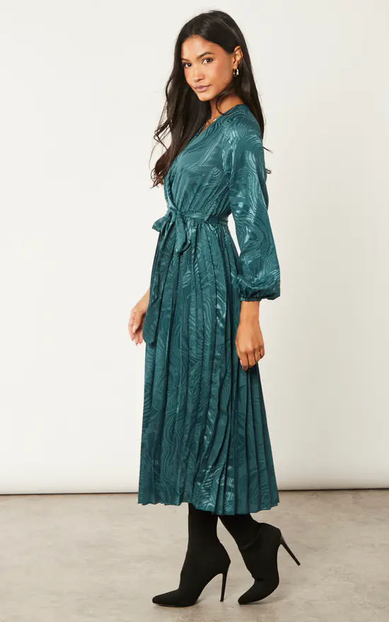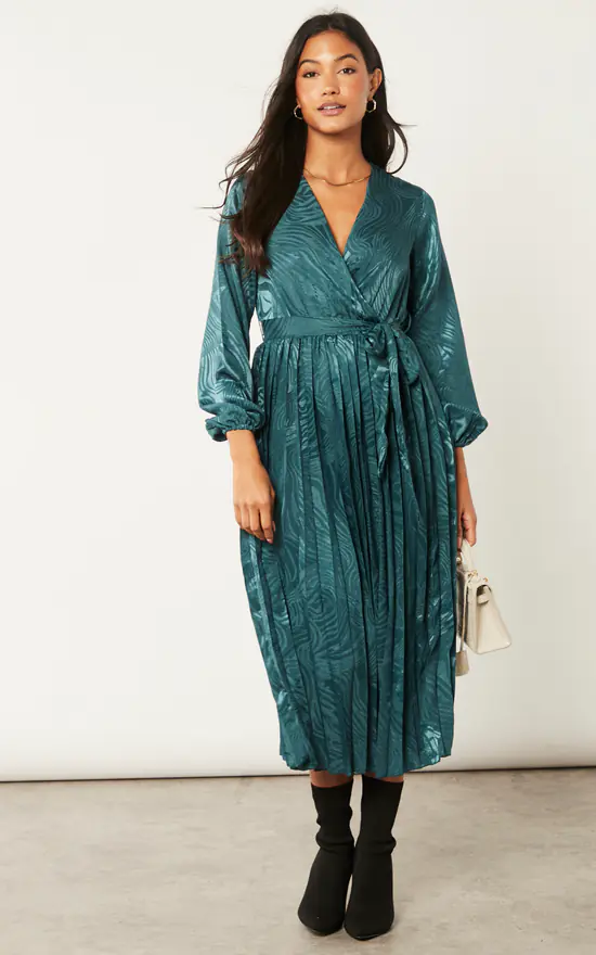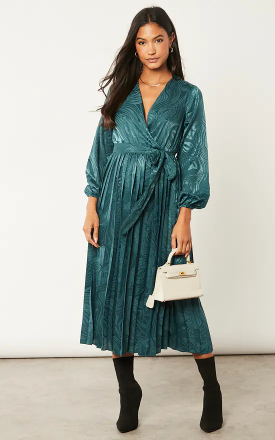 Prints are something that we absolutely love in our dresses, and a jacquard print is just as special. Also with a pleated bottom and wrap front your style is set for the night. Style this bottle green dress with cut out high heels and enjoy a fun evening having cocktails with your friends.