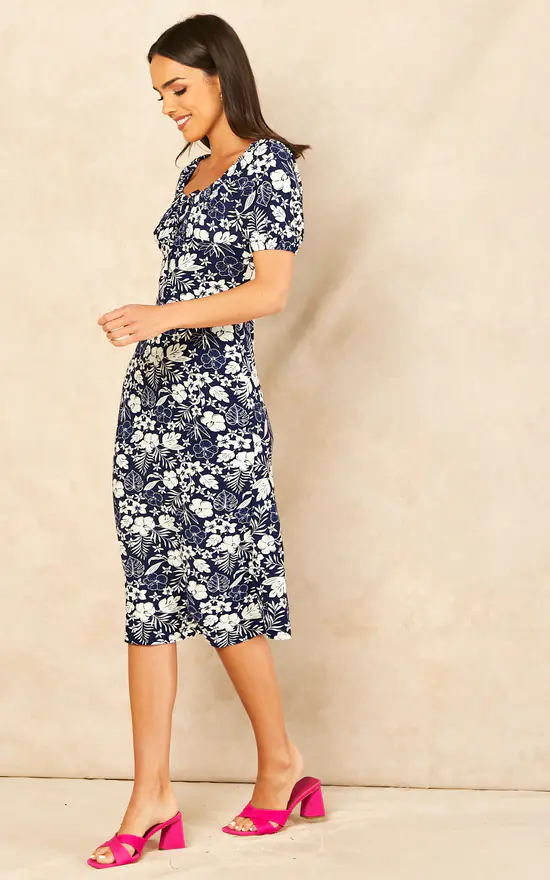 A midi dress for a casual or a special day. The Jenna Pure Vanilla Elasticated Detail Midi Dress in Navy has an elasticated shoulder/chest detail for you to adjust to your liking, and also short sleeves which are perfect for hot Summer day. Complete your look with white ankle strap sandals.