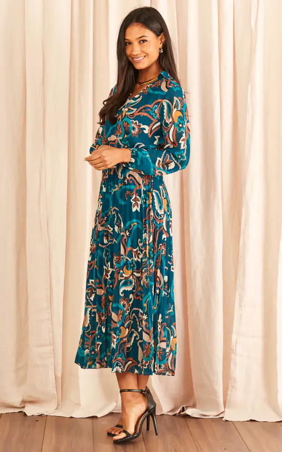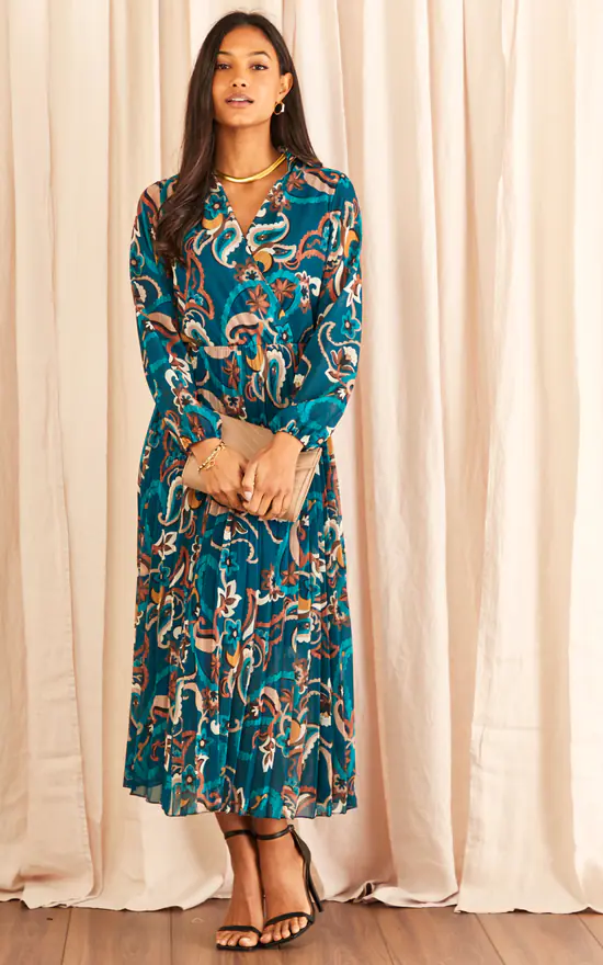 Hey pretty person – we’ve got a beautiful dress for you to wear at special occasions! It has a pleated design, wrap front, v neckline, long sleeve and a flattering elasticated waistline. Don’t forget to style this paisley print dress with ankle strap high heels for a evening killer look!