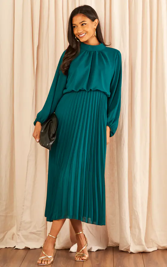 Are you wedding guest, or you have another fancy event coming up? In times of need, elegancy is the way to go. And what better than a green dress with a pleated bottom, high neckline and a midi length. Let’s not forgot to mention the elasticated waistline and cuffs, and the see-through pleated bottom with an inner lining. Block heels and statement jewellery shall take your style to the next level.