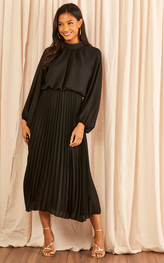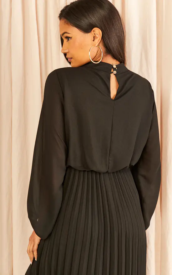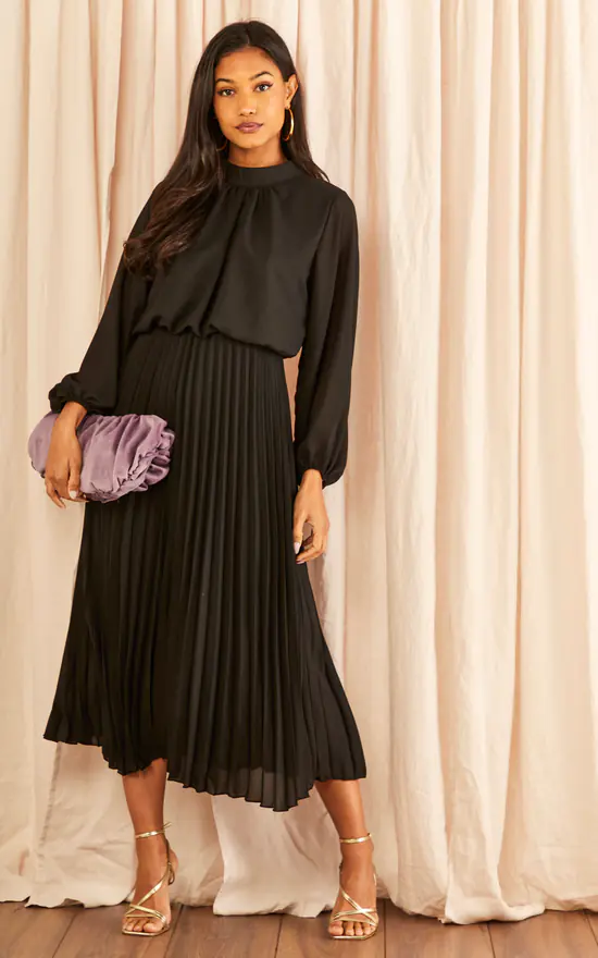 Are you wedding guest, or you have another fancy event coming up? In times of need, elegancy is the way to go. And what better than a dress with a pleated bottom, high neckline and a midi length. Let’s not forgot to mention the elasticated waistline and cuffs, and the see-through pleated bottom with an inner lining. Block heels and statement jewellery shall take your style to the next level.
