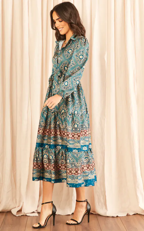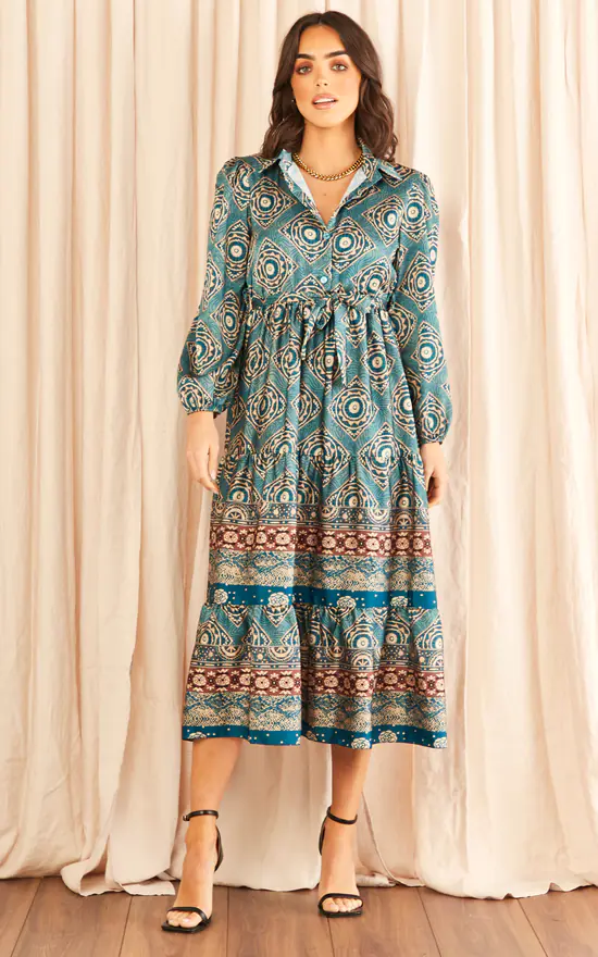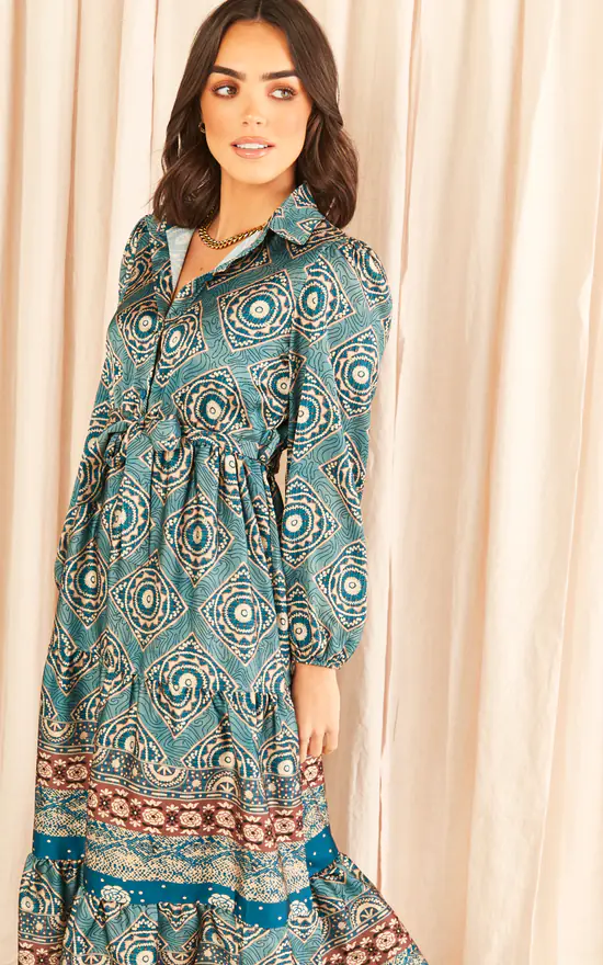 We love shirt dresses as they can be professional, casual, and elegant, depending on where and how you style them. This particular print dress has a waist belt, satin feeling, collared neckline, tiered design, and it is perfect for wedding guests. With a gold necklace, earrings, and ankle strap heels, you will look elegant in no time!