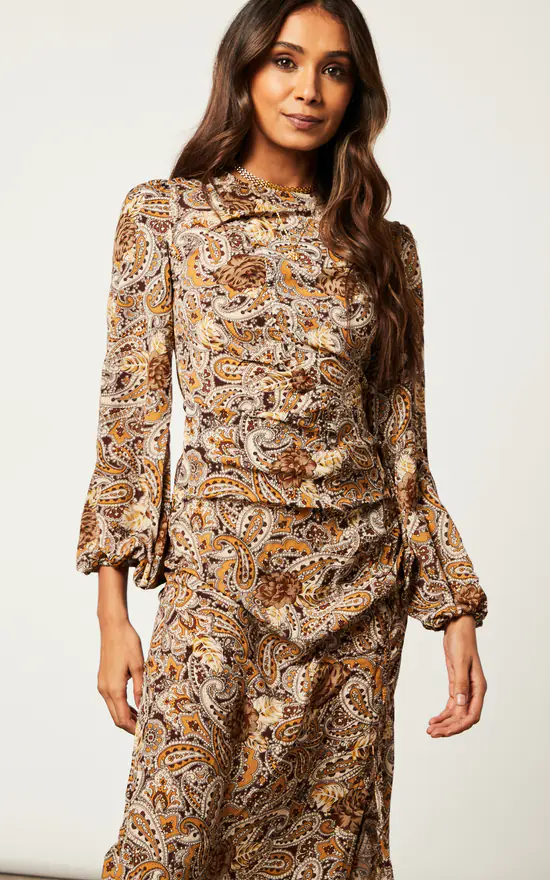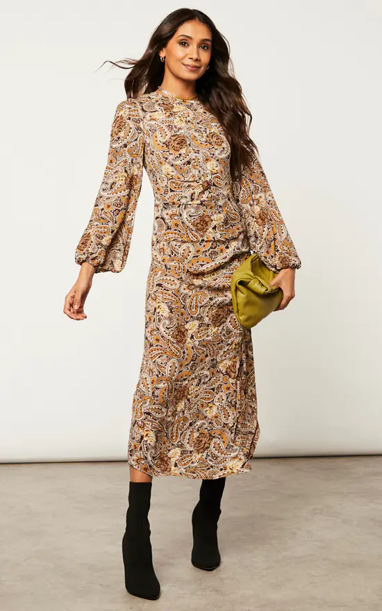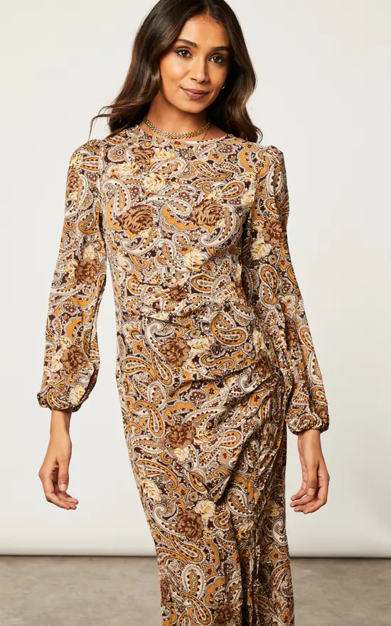 Step out of your comfort zone with this Ruched Midi Dress With Balloon Sleeve. With the classic paisley print, balloon sleeves, back zip, and ruched front which can be tightened to your liking, this dress is ideal for events when matched with high heel shoes.