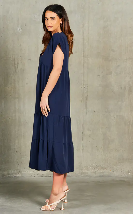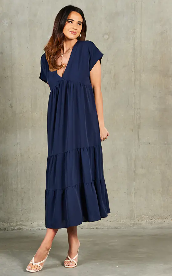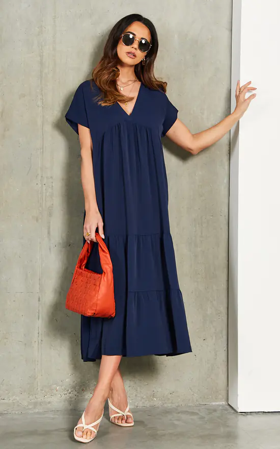 Our comfortable smock midi dress features a flattering v neck and a bouncy tiered skirt. Dress up with heels for the office or wear casually on a weekend day out in trainers or sandals.