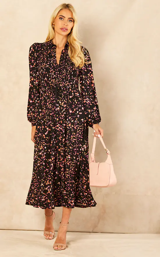 Go from professional woman, to night queen with midi dress. With a shirred bust, button front, puff sleeves and a gorgeous abstract print, elegancy runs through this dress. Ankle strap sandals and a practical mid size bag, are the perfect elements to complete your look.