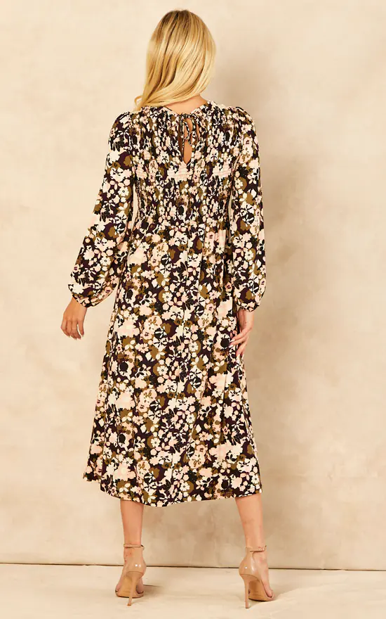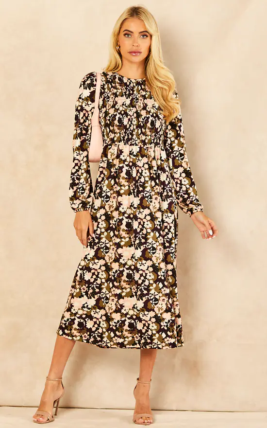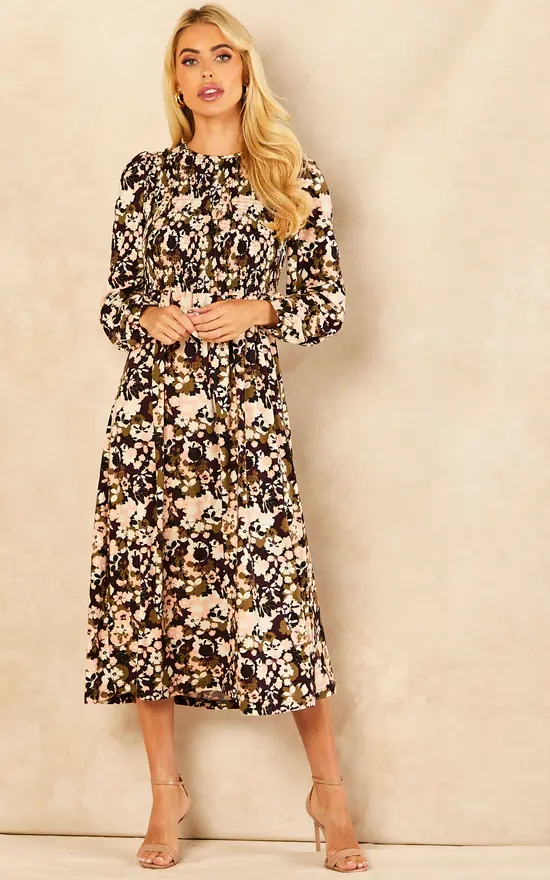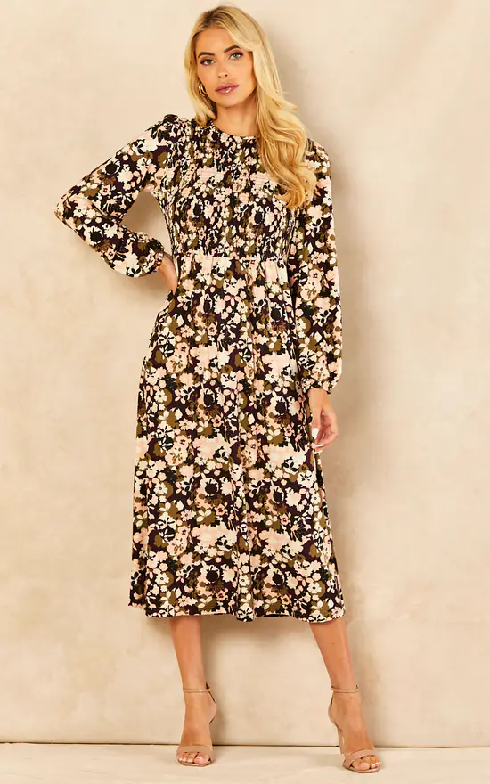 If you are concerned about how to keep your elegancy during the colder months, allow us to introduce you to this smock dress. It has a back tie, floral print, long sleeves and a high neckline. Perfect to keep you warm. Thanks to its fabrics, this midi dress is also highly elasticated. You will not go wrong styling this dress with black tights and high heel boots. Layer with a warm wool coat, and finish off with a tote bag.