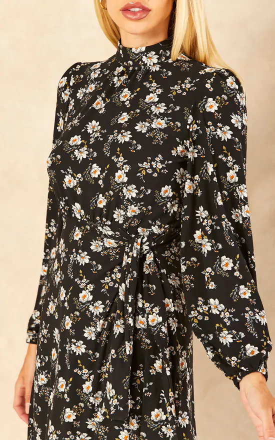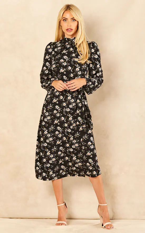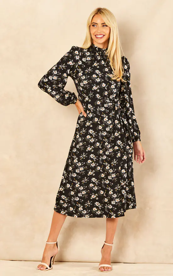 Walk into this season as the elegant woman that you are with the Tie Wrap Midi Dress. This floral pattern dress has an elasticated waist that can be fastened with a tie belt. It features elements that will help stay warm on colder days, such as a high neckline and long sleeves. Complete your look with block heel ankle boots.
