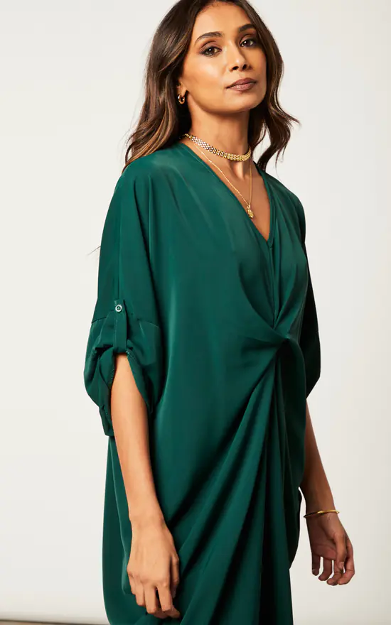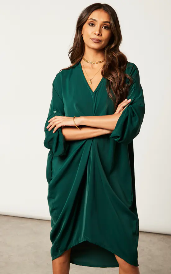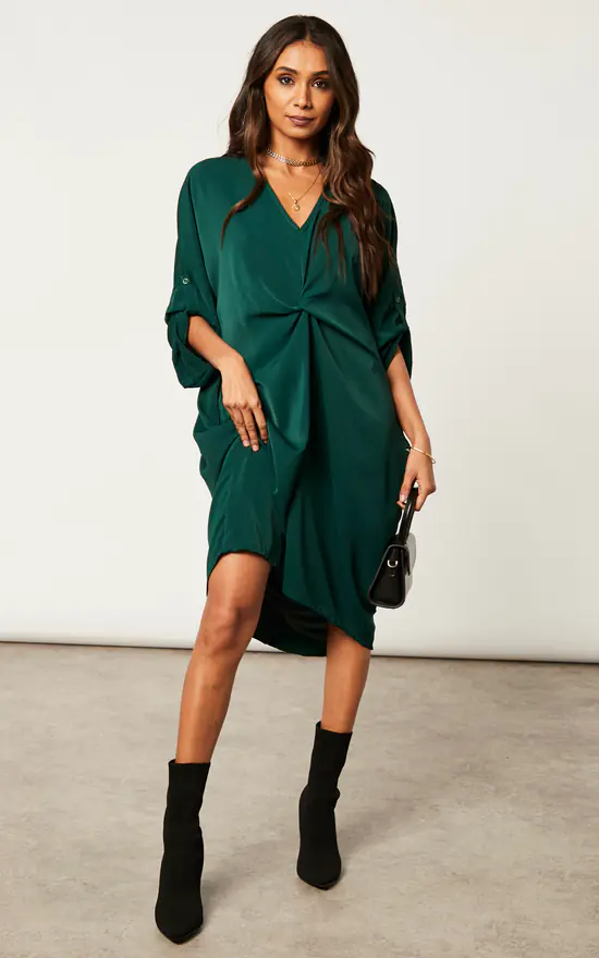 With a v neckline, short sleeves, knee-length, pockets, and a softness that lies between mesh and satin, this is a dress with a twist… literally. White ankle strap heels are your best friend here, layer with a wool black coat and finish off with a small bag, and enjoy a fun evening out with friends.