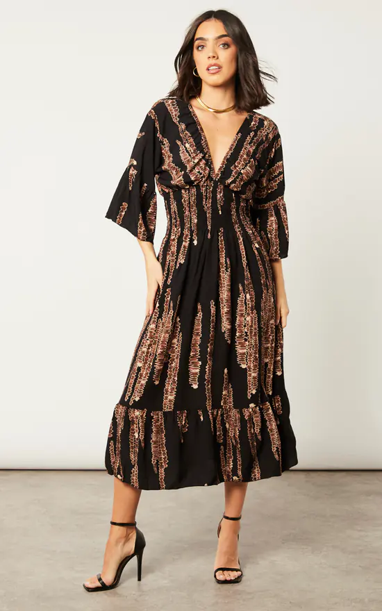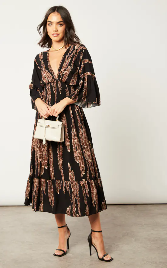 Say hello to the dress you’ve searching for. It has a beautiful deep v-neckline, a highly elasticated waistline, a smock design, and an abstract print. Certainly perfect for fun night outs or special occasions. Ankle strap high heels and a white mini bag will take your style to the next level.