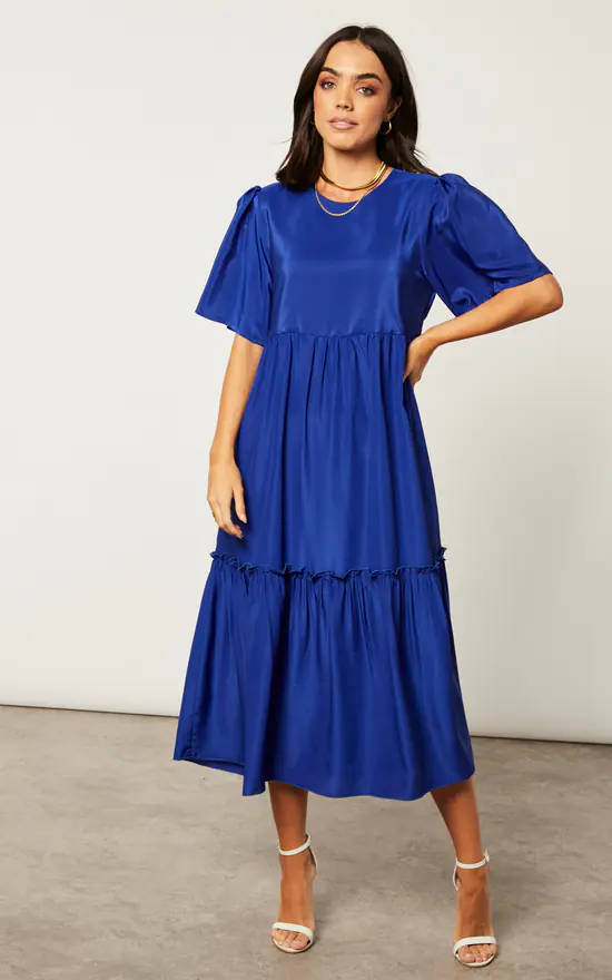 The Emily Dress is a floaty dress with a crew neck. A great style that can be dressed up or down. It has short floaty sleeves and a tie at the back of the neck.