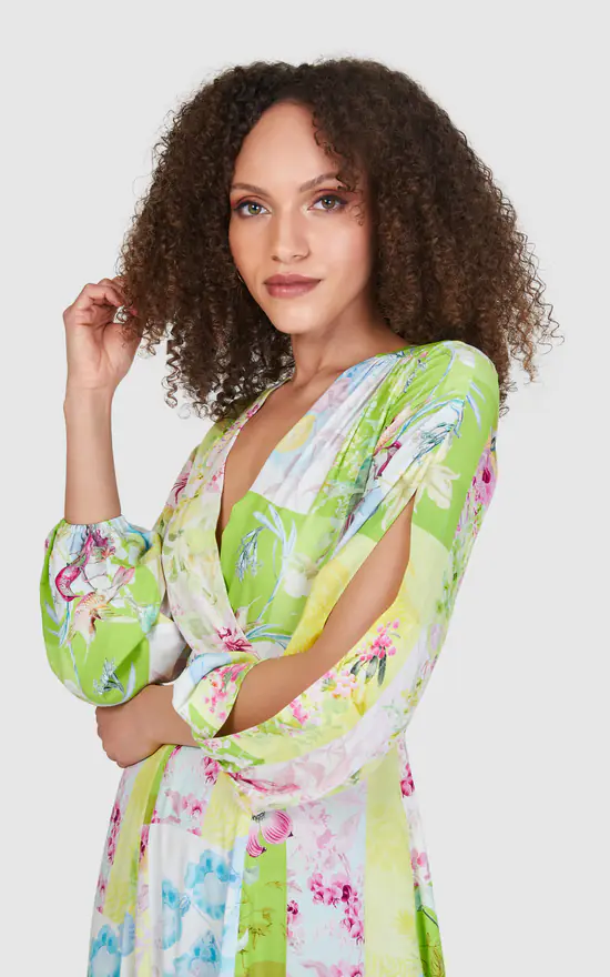 Details: Front cut split, Split sleeves, Elasticated cuffs, A- line silhouette, Wrap front