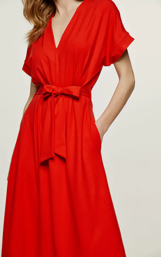 This red summer midi dress is crafted in stretch jersey fabric, viscose-elastane. It has short drop sleeves and a deep V neckline. There is a vertical seam in the front. It has belt loops at the waist with a belt in the same fabric creating the perfect fit. The hem is slightly rounded. The dress is styled in a loose A line silhouette.