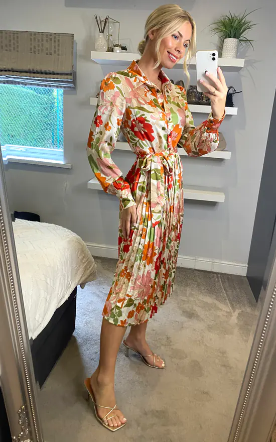Bring your closet to life with this beautiful floral print shirt dress newly designed by D. Anna! Every wardrobe needs a versatile shirt dress like this vibrant print shirt dress. With a shirt collar, a button front, long sleeves, a belt fastening around the waist and a midi length with pleat details, this shirt dress is a perfect choice for work, drinks with friends or evening outs.