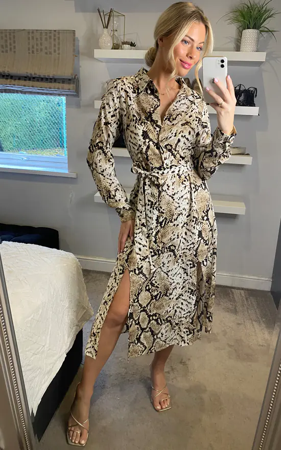 We love this striking python snakeskin dress newly designed by D. Anna. With a shirt collar, button front, long sleeves, a belt fastening around the waist and a midi length with pleat details, this shirt dress is a perfect choice for work, drinks with friends or evening outs.