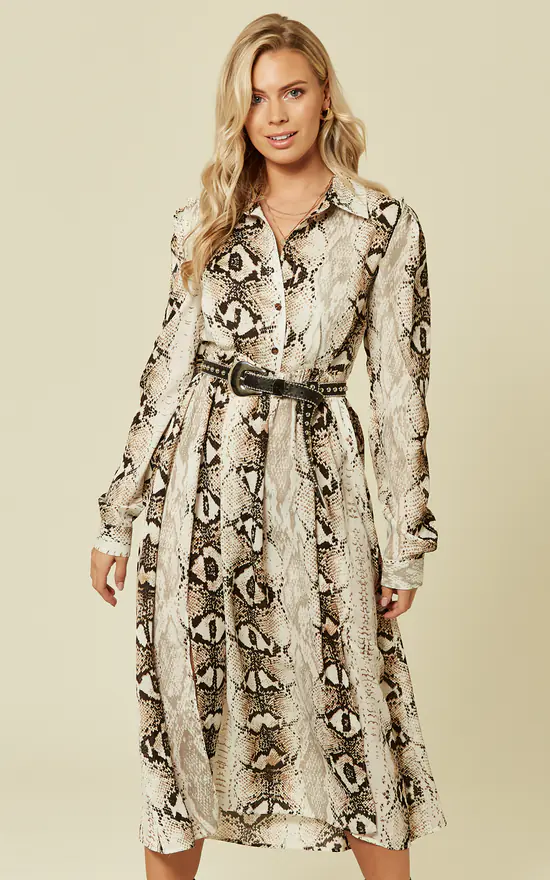 We are loving the D. Anna Snake Print Shirt Dress, with shirt collar, long sleeves, and snake pattern. Whatever the day may throw at you, do so in style with this on-trend and versatile shirt dress. Perfect to dress up from day to night with boots and a leather jacket!