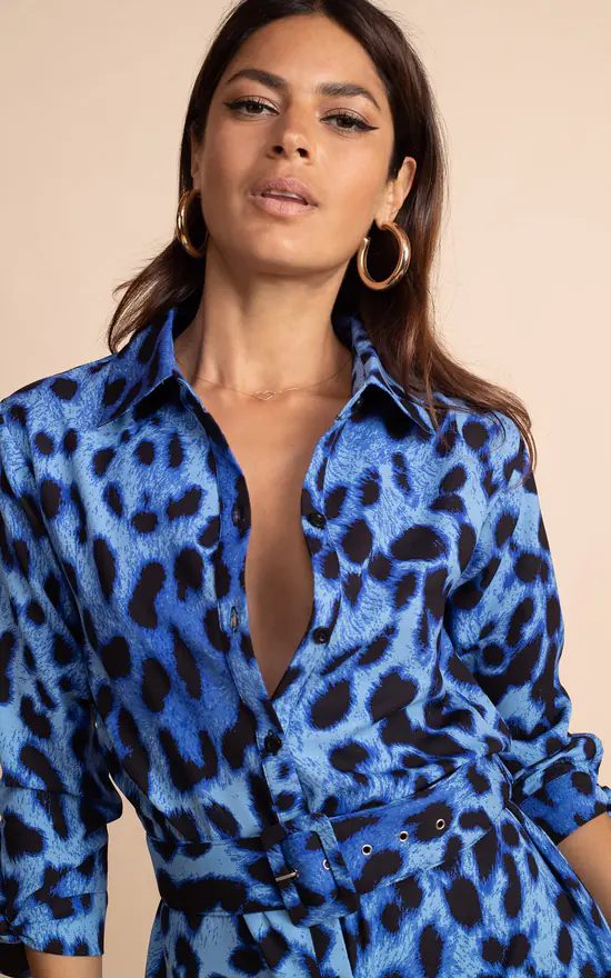 This fierce bright blue is a mood boosting style. This gorgeous floral dress works from the office to after-hours. Featuring ¾ length sleeves with tie-cuffs and a flattering waist belt with a retro square buckle. Complete with a fully-buttoned front that can be adjusted to suit your style of neckline or leg slit.