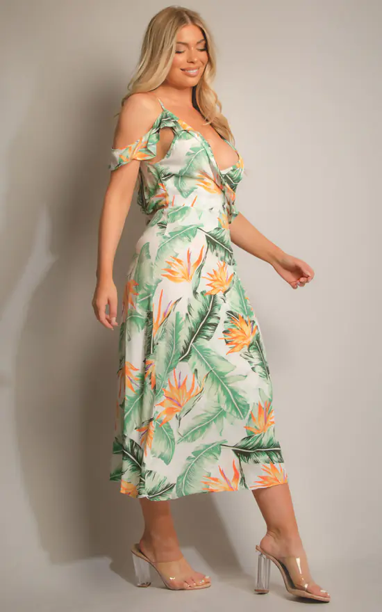 We are totally crushing on prints this season and this pretty tropical print wrap dress is not exception. With the added frill detail this dress is perfect for those sunny days and date nights this time of the year. Style with strappy heels and hoops.