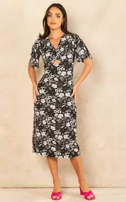 New ???? Chekani Square Neck Puff Sleeve Midi ???? Dress In Black And Gold Spot Velvet | Eliza ????