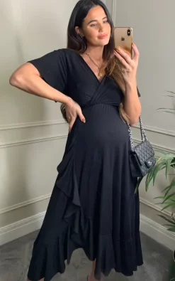 Cheap ???? Tiffany Rose Maternity Waterfall Maternity Midi Wedding Guest ???? Dress In Black ????