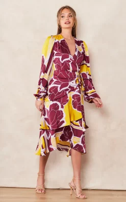 Deals ✨ Liquorish Geometric Floral Print Midi Wrap ???? Dress In Mustard And Burgundy ????