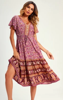 Best Pirce ???? FS Collection Floral Printed Tiered Boho Midi ???? Dress In Rusty Pink ✔️