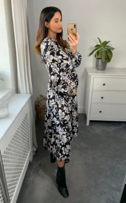 Best Pirce ???? FS Collection Side Zip Button Detail Floral Midi Wrap ???? Dress In Black ????