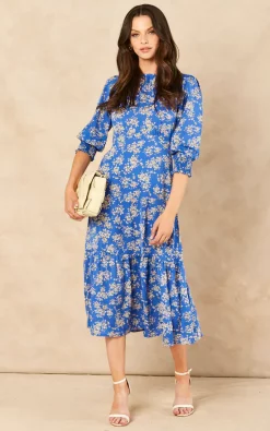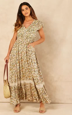 Wholesale ???? Belle Love Italy Sarah Ruffle Sleeve Shirred Midi ???? Dress Green Beige Tribal ????