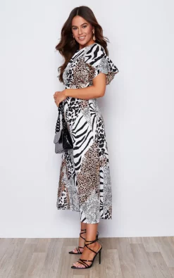 Best Sale ???? Girl In Mind Britney Angel Sleeve Split Leg Midi ???? Dress White Animal Print ????