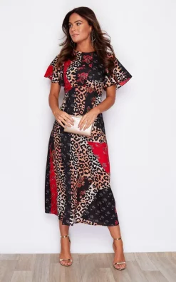 New ???? Girl In Mind Britney Angel Sleeve Split Leg Midi ???? Dress Leopard Multi Print ????