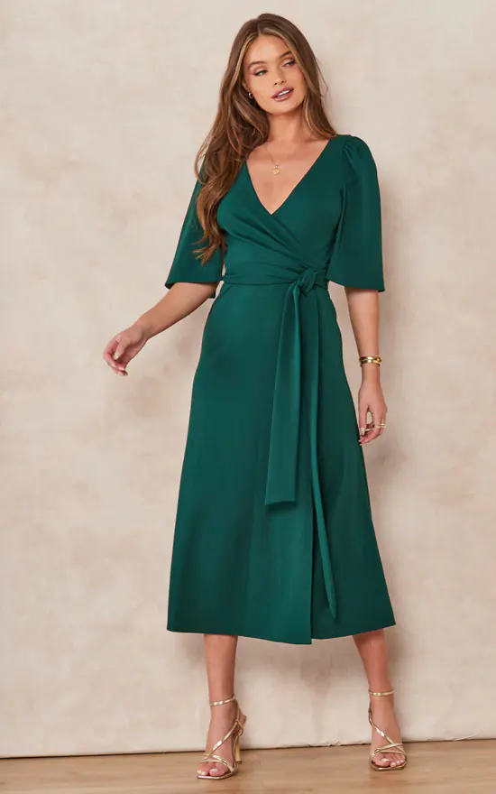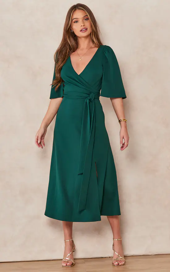 Cape split sleeve mock wrap dress with side split and self tie. Top is a mock v neck wrap with a cape sleeve that has a split inside the arm as an extra detail. Skirt has a side split to show just the right amount of leg. Also available in a print version.