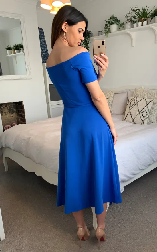 Bardot off shoulder midi dress from Feverfish in a gorgeous royal blue. This design has a flattering off-shoulder neckline with an asymmetric frill detail skirt and a tie belt at waist. This chic design is perfect for a formal occasion and is made in stretch scuba crepe fabric.