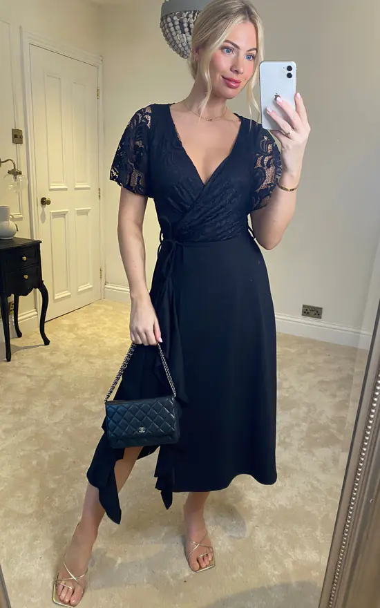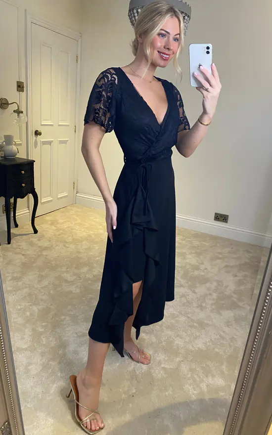 Feverfish lace frill midi dress ,this design features a lace bodice with short fluted sleeves combined with a frill detail midi skirt ,finished with tie belt at waist this is a show-stopping design for this season .