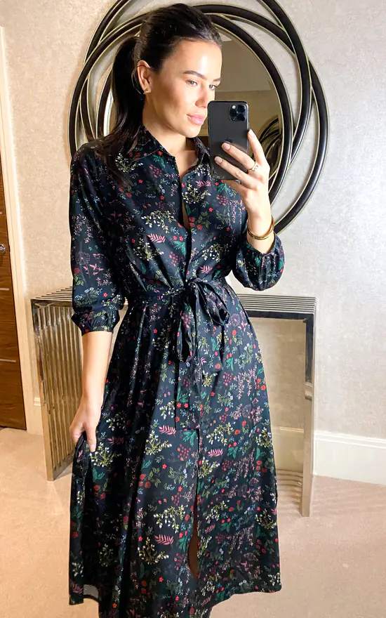 Black Floral Print Shirt Dress