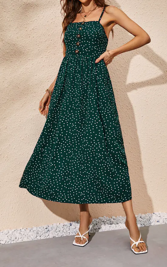 Polka Dot Button Down Strappy Midi Dress In Dark Green