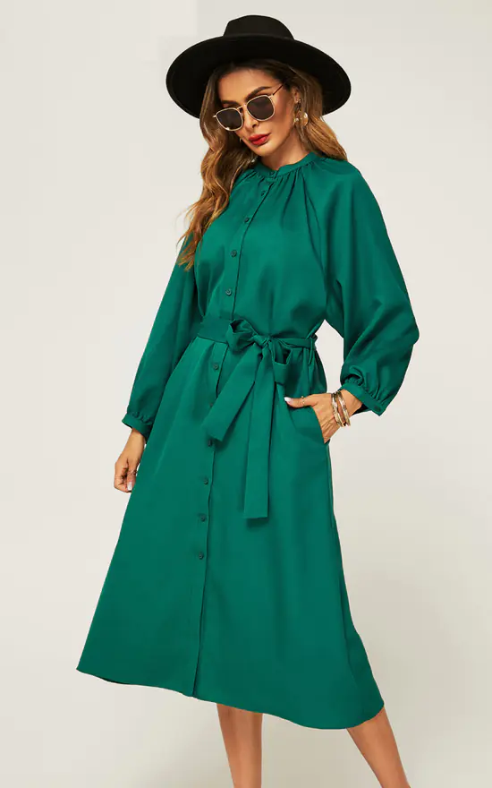 Button Down Midi Shirt Dress With Tie Waist In Green