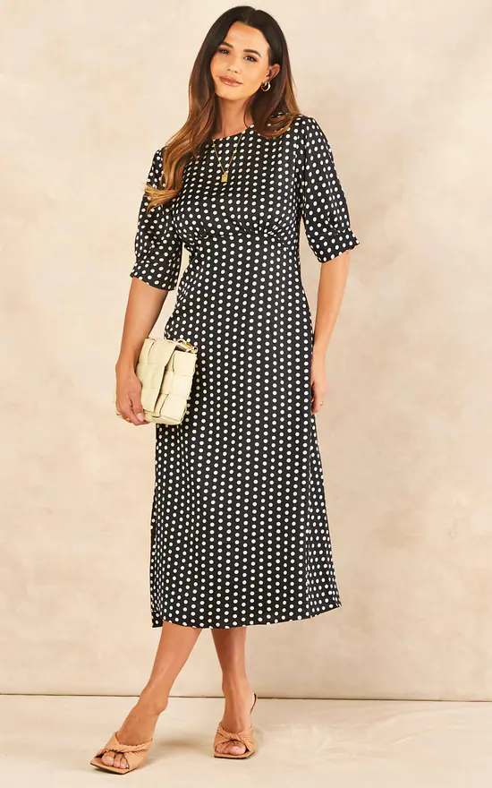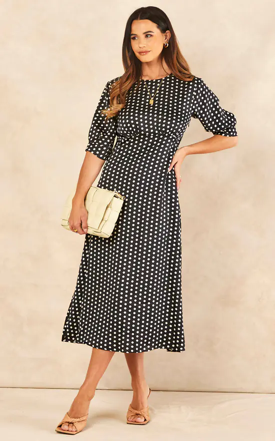 This Black Satin Polka Dot Shift Midi Dress adds easy glamour to your wardrobe with its versatile, flattering, and on-trend polka dot print! It’s cut to give a defined waist and has a slim fit, a simple round neck, half sleeves, and a modern midi-length hem.