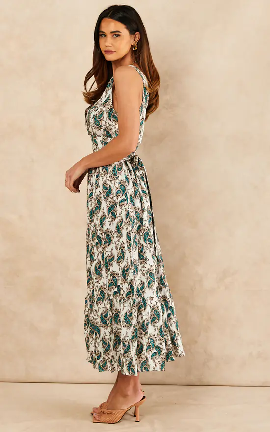 With a sleeveless design with back tie belt, plunging V neckline made by the wrap top style, and a fluttering skirt, this charming paisley printed midi is designed in a figure-skimming silhouette. To complete your look, slip in to our Cream Paisley Wrap Top Cotton Midi Dress with one of your favourite handbags.