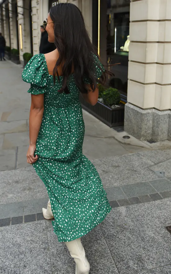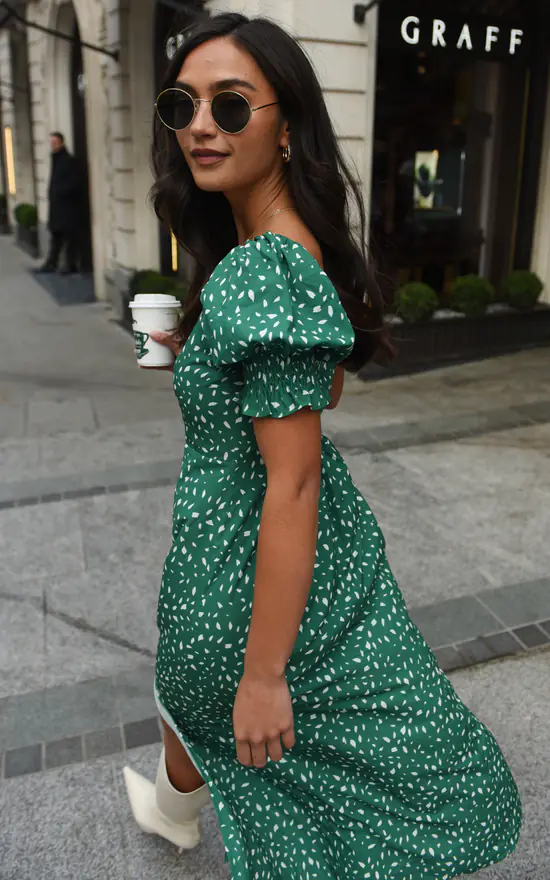 This new-in Green Animal Print Split Hem Midi Dress will add a pop of color to your print wardrobe. It has an all-over animal print and is composed of a soft and lightweight fabric with flowy slits and short puff sleeves with shirred cuffs in a midi length. Pair with a tiny handbag and heels or boots for a terrific weekend look!